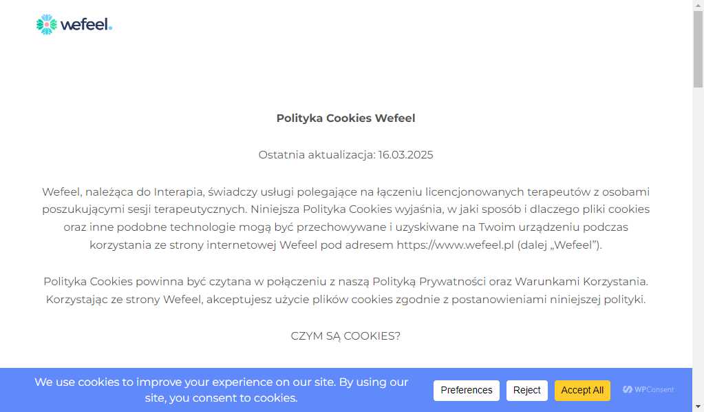 WeFeel to przestrzeń dla osób potrzebujących wsparcia, gdzie terapia online odbywa się w wygodnej formule zdalnej. Specjaliści pracują w ujęciu krótkoterminowym, dostosowując spotkania do indywidualnego tempa i możliwości klienta.Platforma umożliwia kontakt z terapeutami różnych nurtów, co pozwala dopasować formę pracy do potrzeb — od rozm